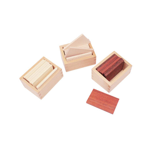The Baric Tablets introduce and refine the concept of the baric sense. While blindfolded, the child endeavors to discern the weight of the tablets. Error is controlled by the color of the wooden tablets, the lightest color being the lightest weight to the darkest color being the heaviest weight. The set consists of 3 boxes containing 10 each of light, medium and heavy weight tablets.