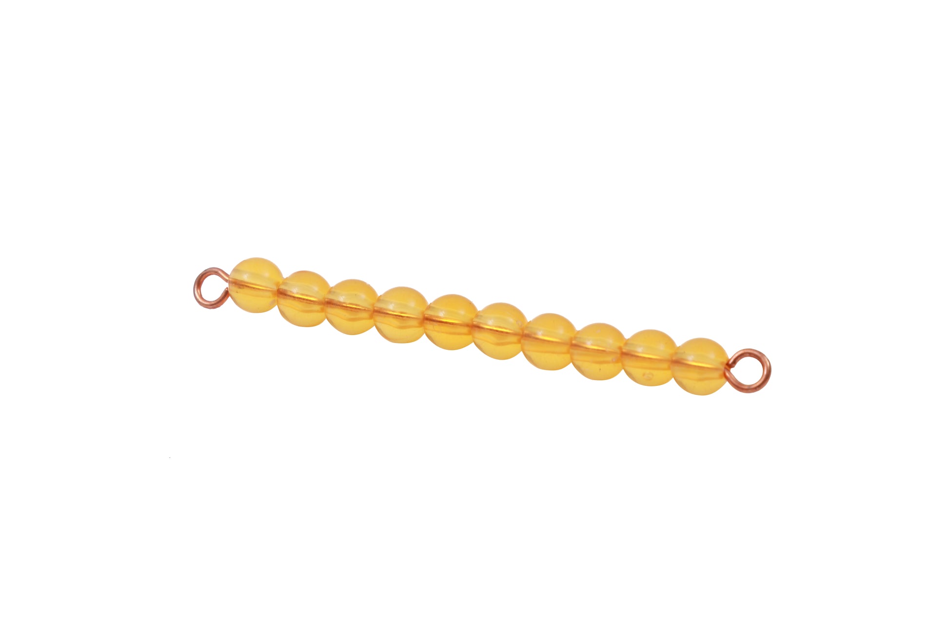 Set of golden bead material as follows: a bead unit, a bead bar, a bead square, and a bead cube. Comes with a wooden storage tray. This set is a concrete representation of the decimal system from 1 to 1000, demonstrating place value and the concept that a decimal category cannot exceed nine.