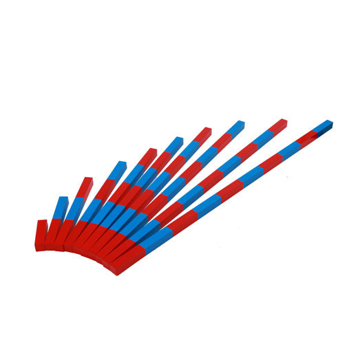 The Number Rods introduce the child to quantity 1–10 and their corresponding number names. Through exploration with the material, the child also develops concepts in sequence of number, combinations of 10 and basic arithmetic. The material consists of 10 wooden rods, divided into units by alternating colors of red and blue, progressing in 10 equal steps from 10 cm to 1 meter.