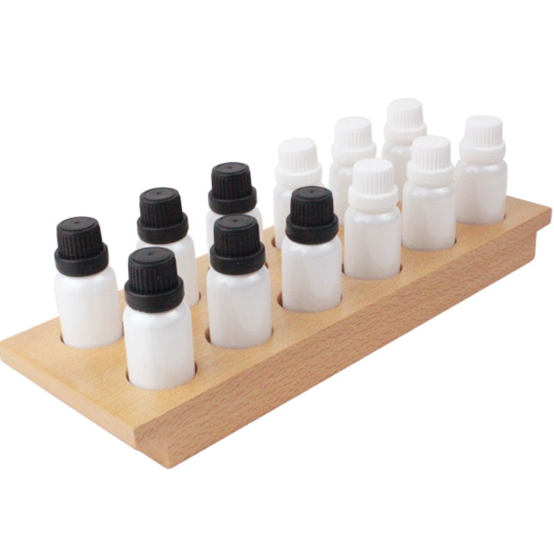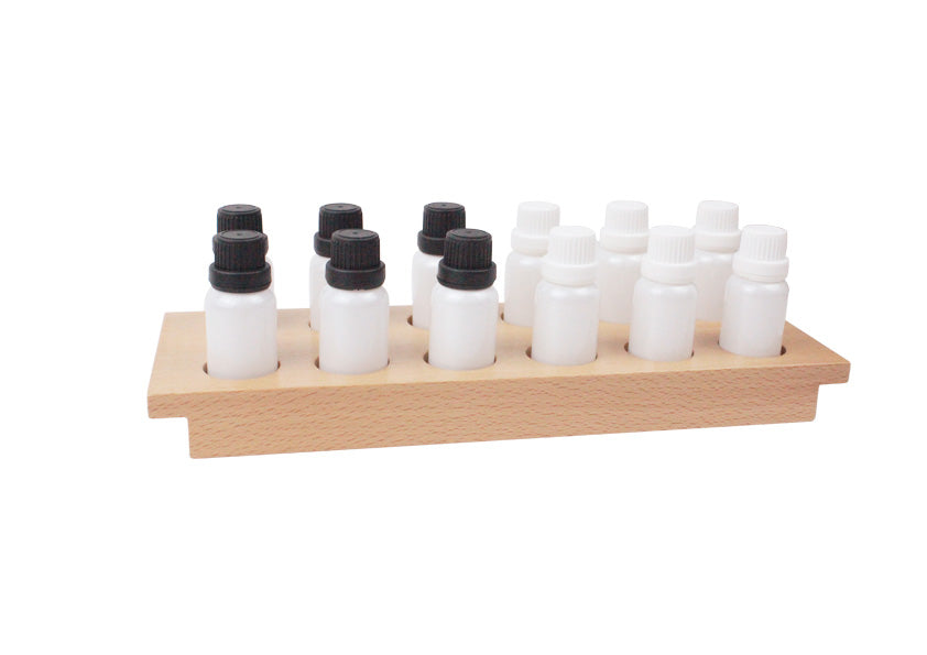 The Smelling Bottles are used to refine the olfactory sense through matching. The teacher prepares the bottles with a variety of pairs of scents. The set consists of a wooden tray that holds 12 glass bottles – 6 black lids, 6 white lids.