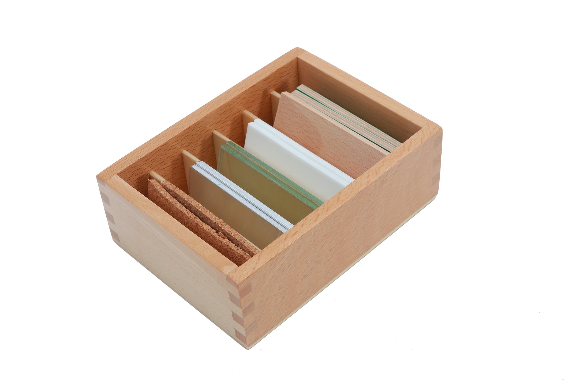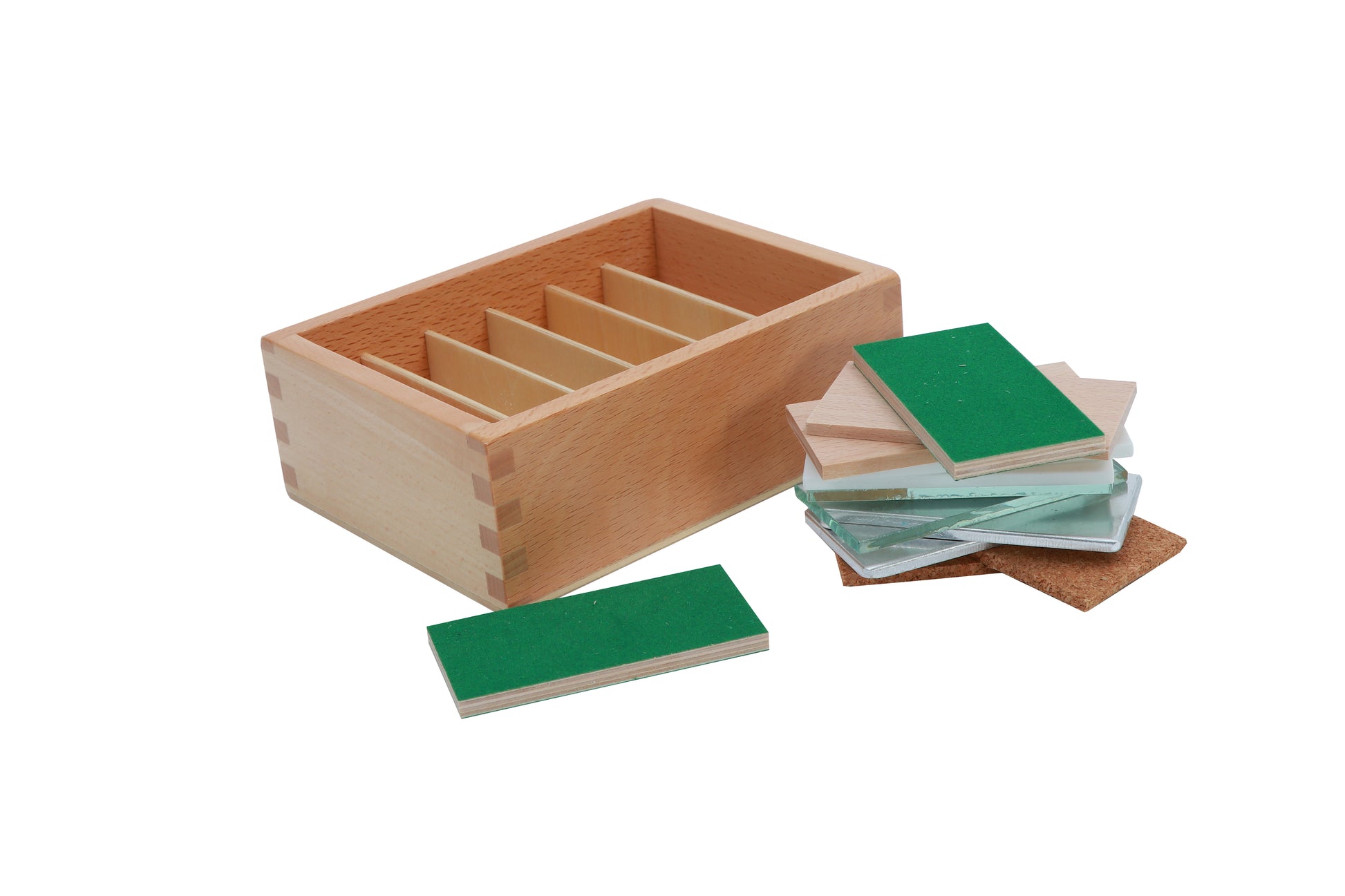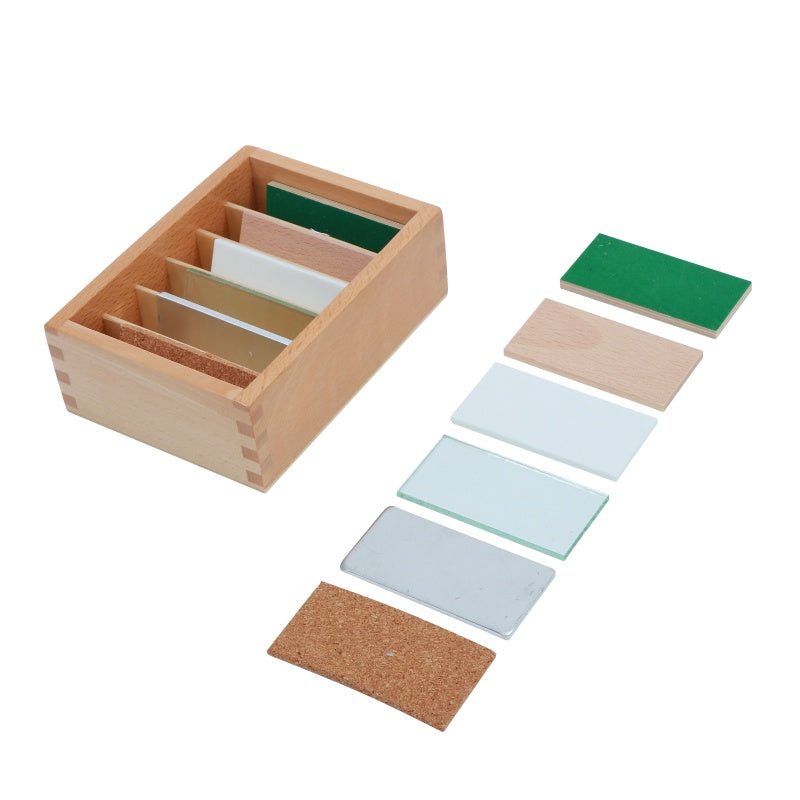 The Thermic Tablets are used to cultivate the ability to discriminate thermic qualities. Consists of a wooden box divided into 6 compartments containing six pairs of 8 x 4 cm tablets made from felt, wood, steel, cork, glass and marble.